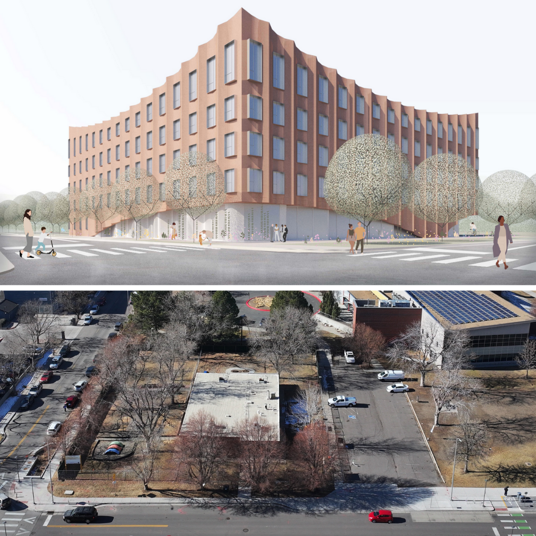 The 5 story building is planned to include 60 three bedroom units and 20 four bedroom units, a unit mix that is increasingly uncommon in new multifamily construction across Denver. All residences are organized around a central courtyard designed as a landscaped pocket park, providing shared outdoor space for residents.