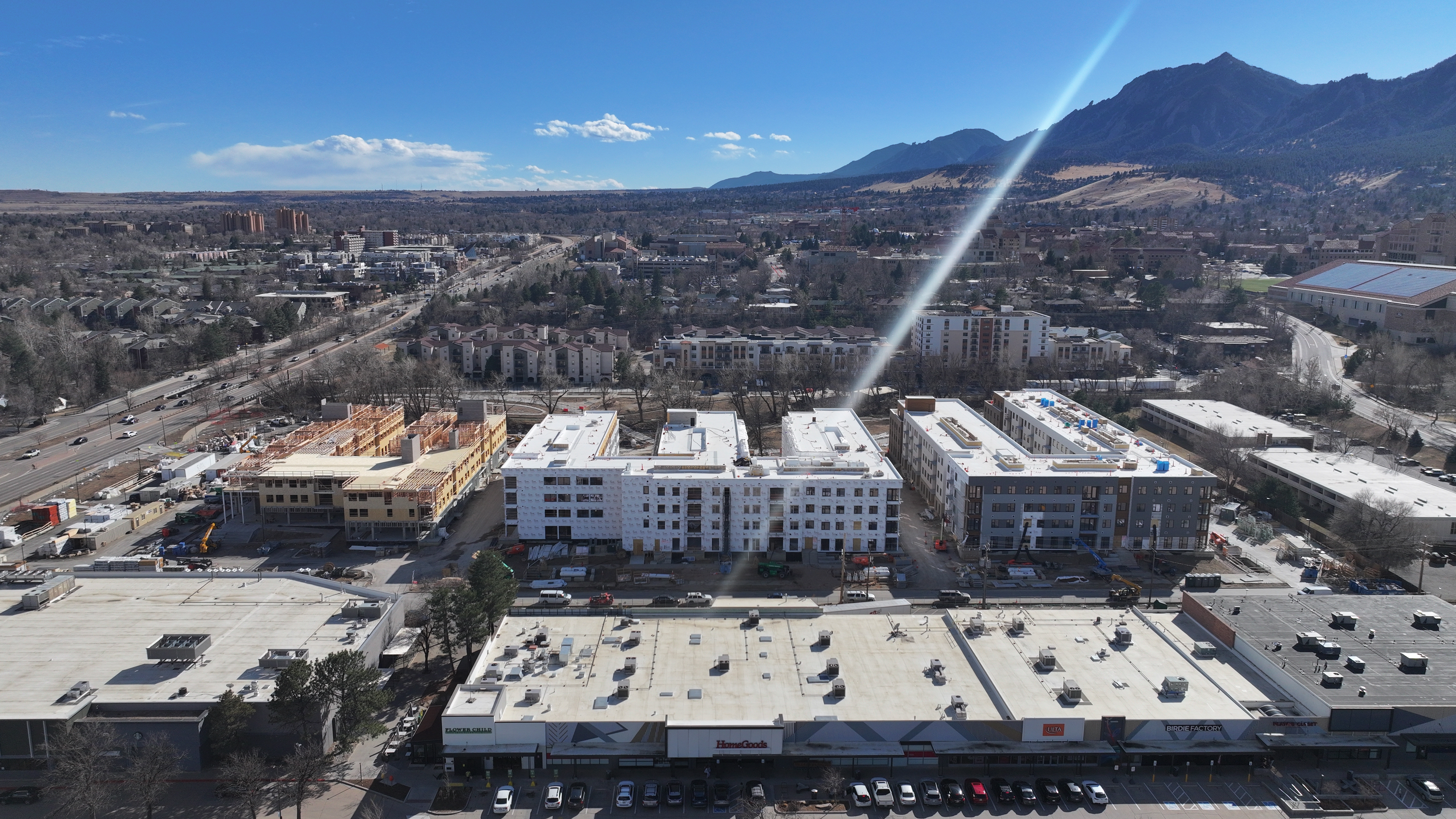 New aerial photos show major progress on The Standard at Boulder, Landmark Properties’ 936-bed student housing community rising on the former Harvest House Hotel site near the University of Colorado Boulder. Framing and exterior work is now clearly advancing across multiple sections of the building, with the project’s footprint, rooflines, and massing well defined in the skyline.