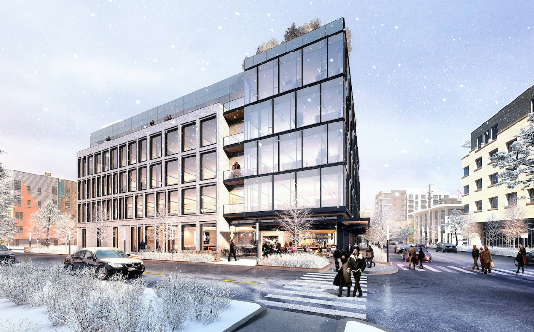 The 5-story project, spanning approximately 100,000 square feet, integrates office and retail spaces and boasts a 5,600-square-foot rooftop.