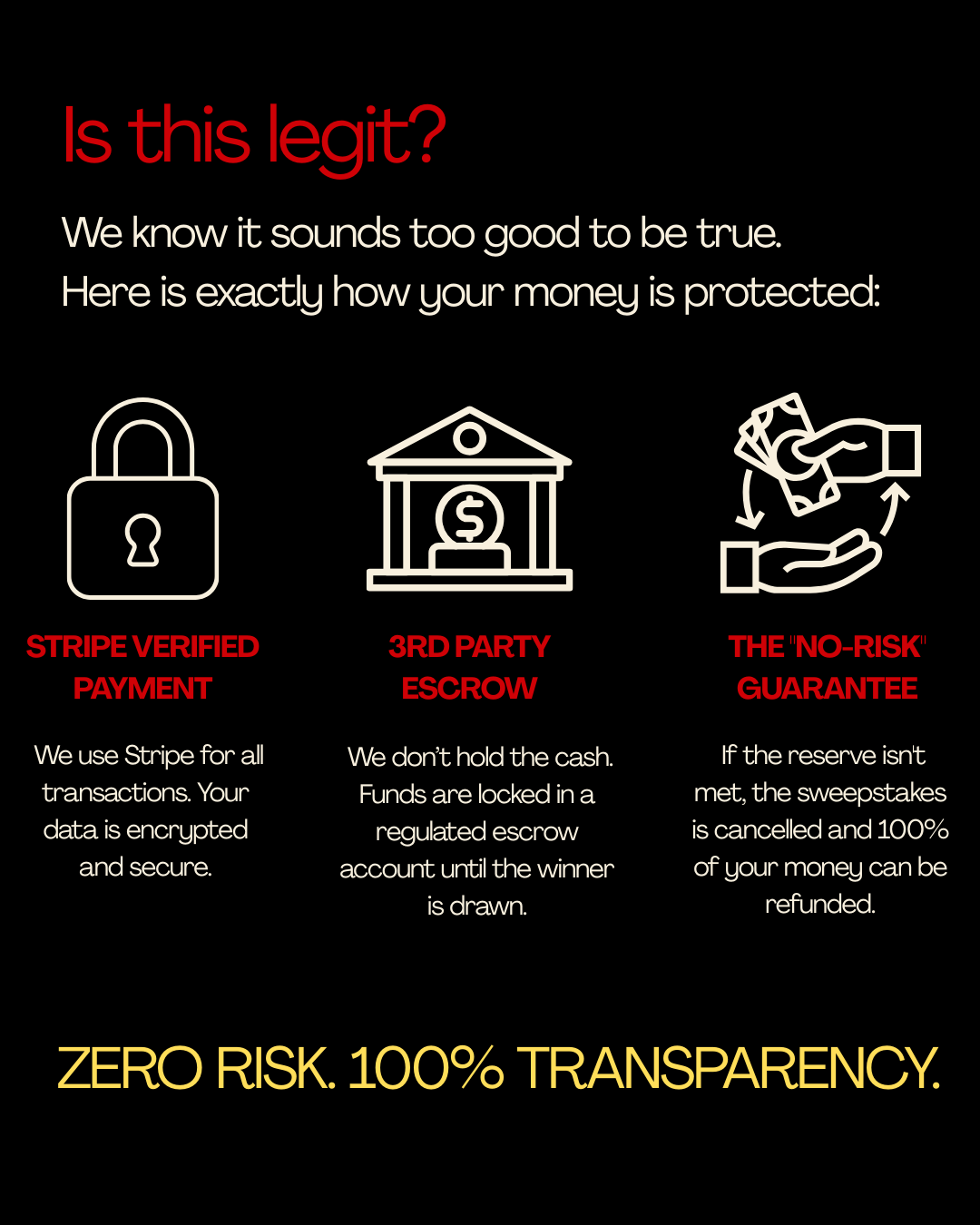 Because the model is unconventional, FulHouse built the process around security and transparency. Payments are handled through Stripe. Funds are held in a regulated third-party escrow account rather than by the company. If the sweepstakes does not reach its reserve, the drawing is canceled and entrants are eligible for a full refund.