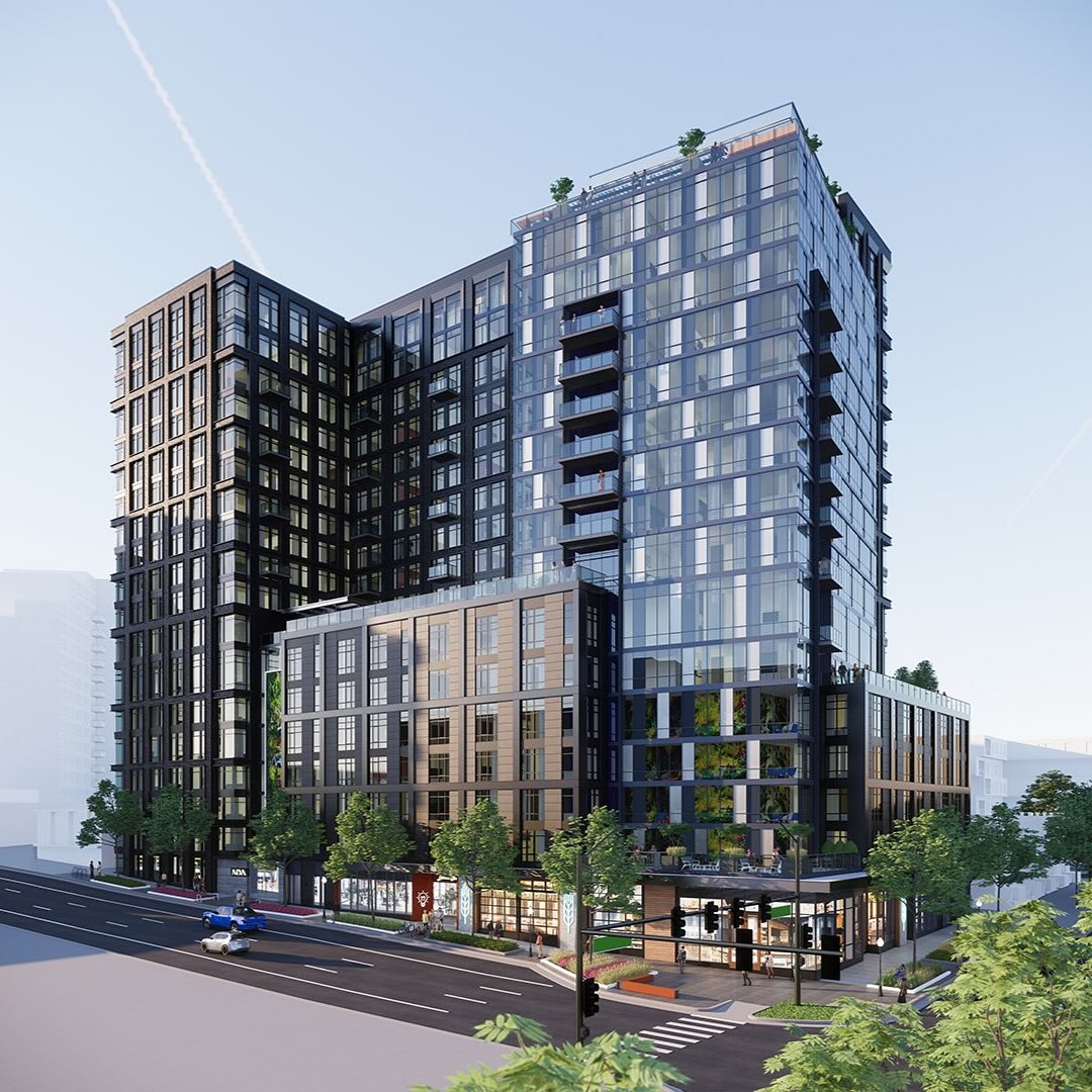 The project includes 8,500 square feet of retail and a mix of wellness-focused amenities: a rooftop infinity pool, sauna, co-working space, and two-story club lounge.