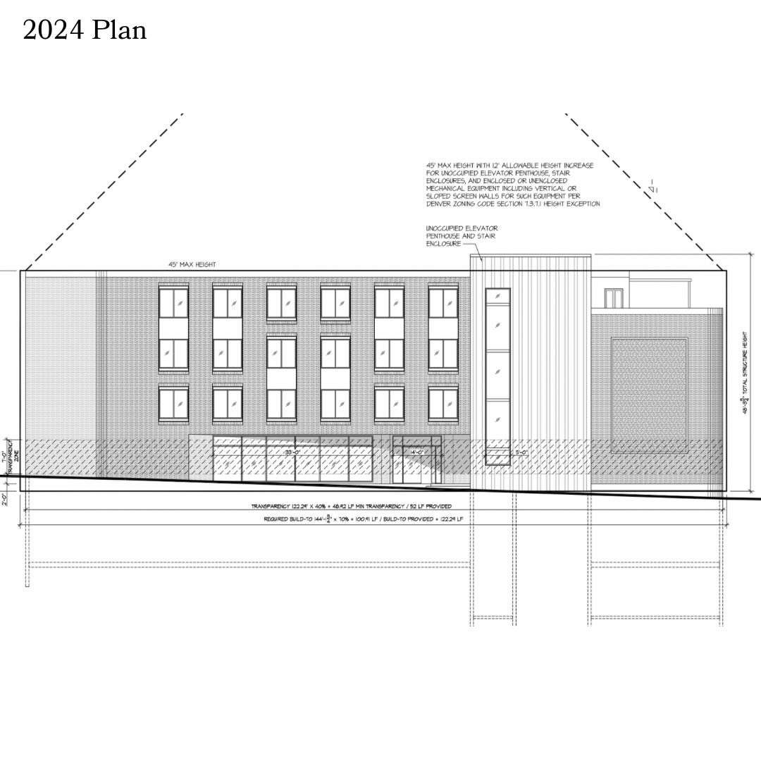 The earlier 2024 concept called for a four story hotel with 70 rooms and 18 parking spaces. The new November 2025 filing reduces the massing significantly. The project, submitted by architect Rachel Fox of RealArchitecture for owner BP Land, now outlines a three story building with 69 keys and a total area of 30k square feet. The design takes advantage of the steep grade by placing a basement level entry on Erie Street with three levels of guestrooms above. The interior program includes a lobby, bar and lounge, back of house operations, and rooftop access with guest amenities that overlook the surrounding LoHi blocks.