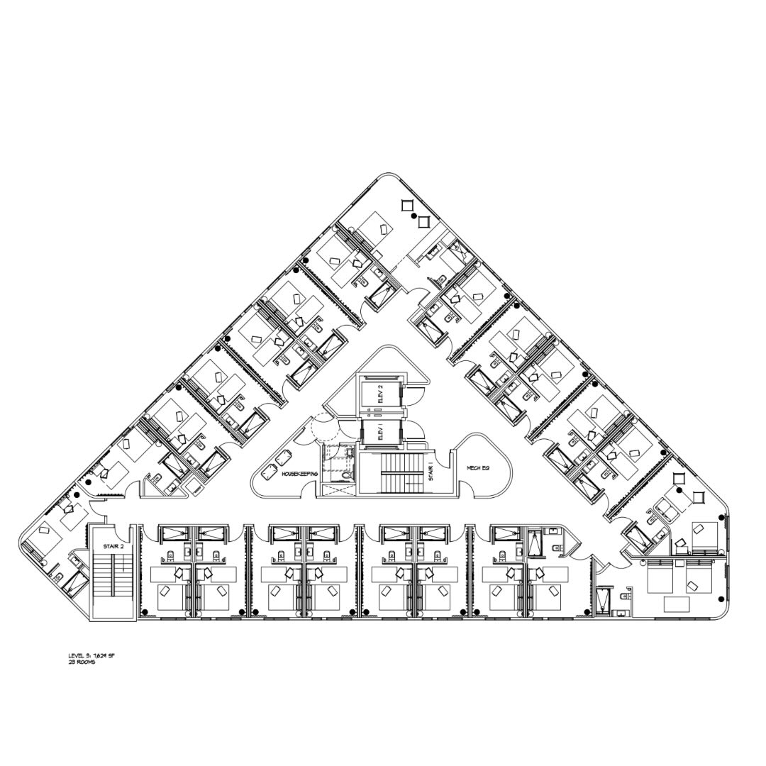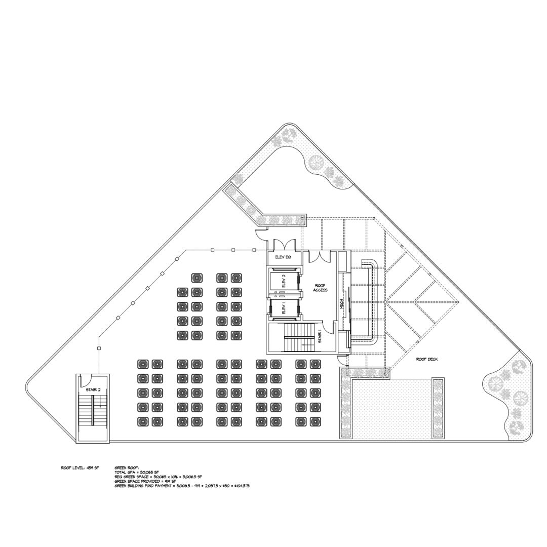 The updated structure is shaped tightly to the triangular lot with a continuous street facing facade and a curved corner at the south point. Due to the small parcel and challenging topography, the new plan removes all on site parking. Instead, the submission proposes two on street loading spaces for guest drop off, deliveries, and service functions. Sidewalks and tree lawns remain unchanged, and the request for a small right of way vacation at the north edge of the site continues as part of the review.