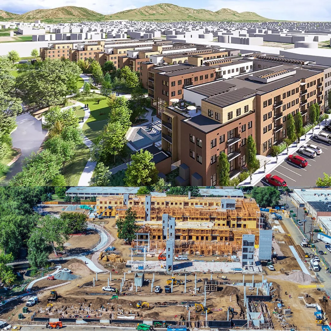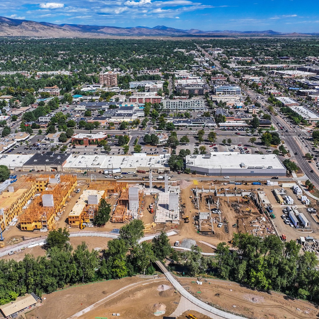 As part of the development, nearly six acres of public green space will front Boulder Creek, including lawns, pickleball courts, and a creek-edge trail. Improvements to the Boulder Creek Path, which runs directly through the site, are also progressing.
