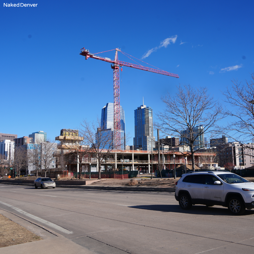 The 12 story mixed use building is located at 11th Street and Auraria Parkway on the north end of campus, across from Ball Arena and just east of the Tivoli Garage. Recent construction activity shows the concrete podium structure completed, with vertical construction progressing above grade.