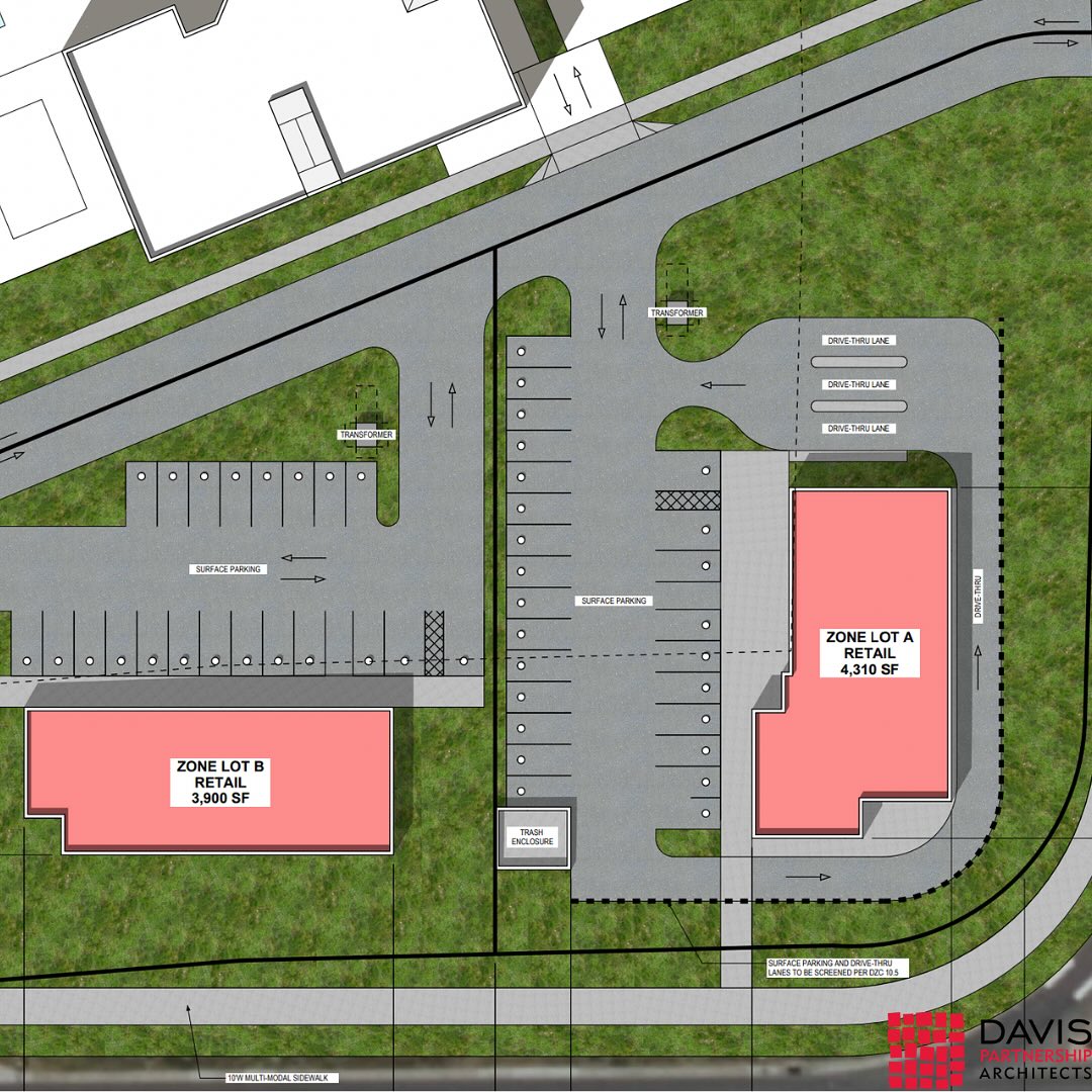 Two of the new lots (A and B) would feature retail uses, while Lot C would accommodate multi-unit housing, blending residential and commercial to replace an aging office building.